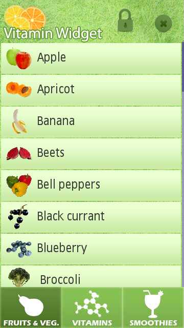 The Vitamin Widget provides you useful information about every vitamin. It tells you how a selected vitamin helps the body. It also tells you about the source of that perticular vitamin you selected on screen. Select a fruit or vegetable and it will provide you complete detail about that fruit or vegetable. For example - what all vitamins you get from that fruit and what all good it have for your body.